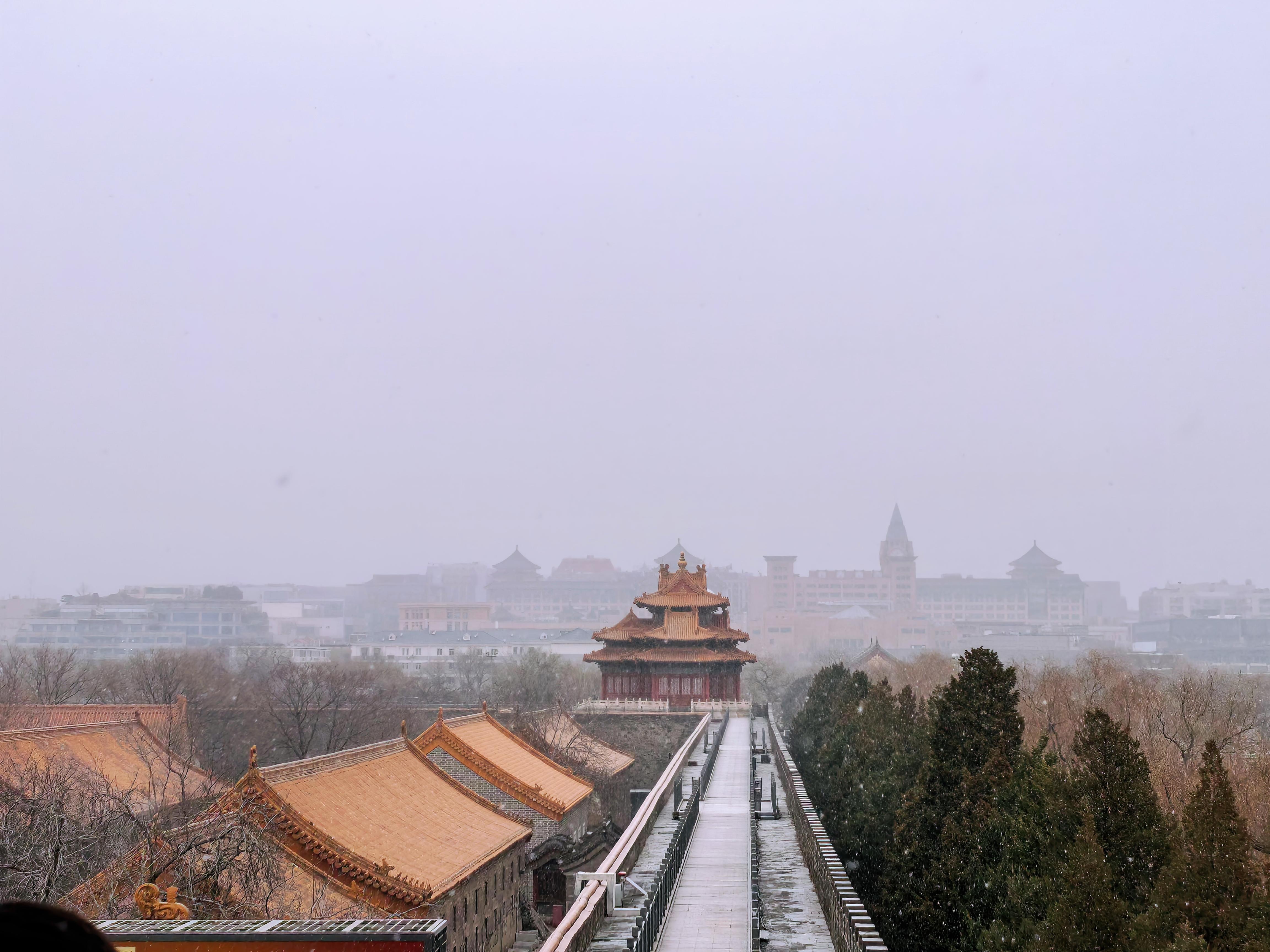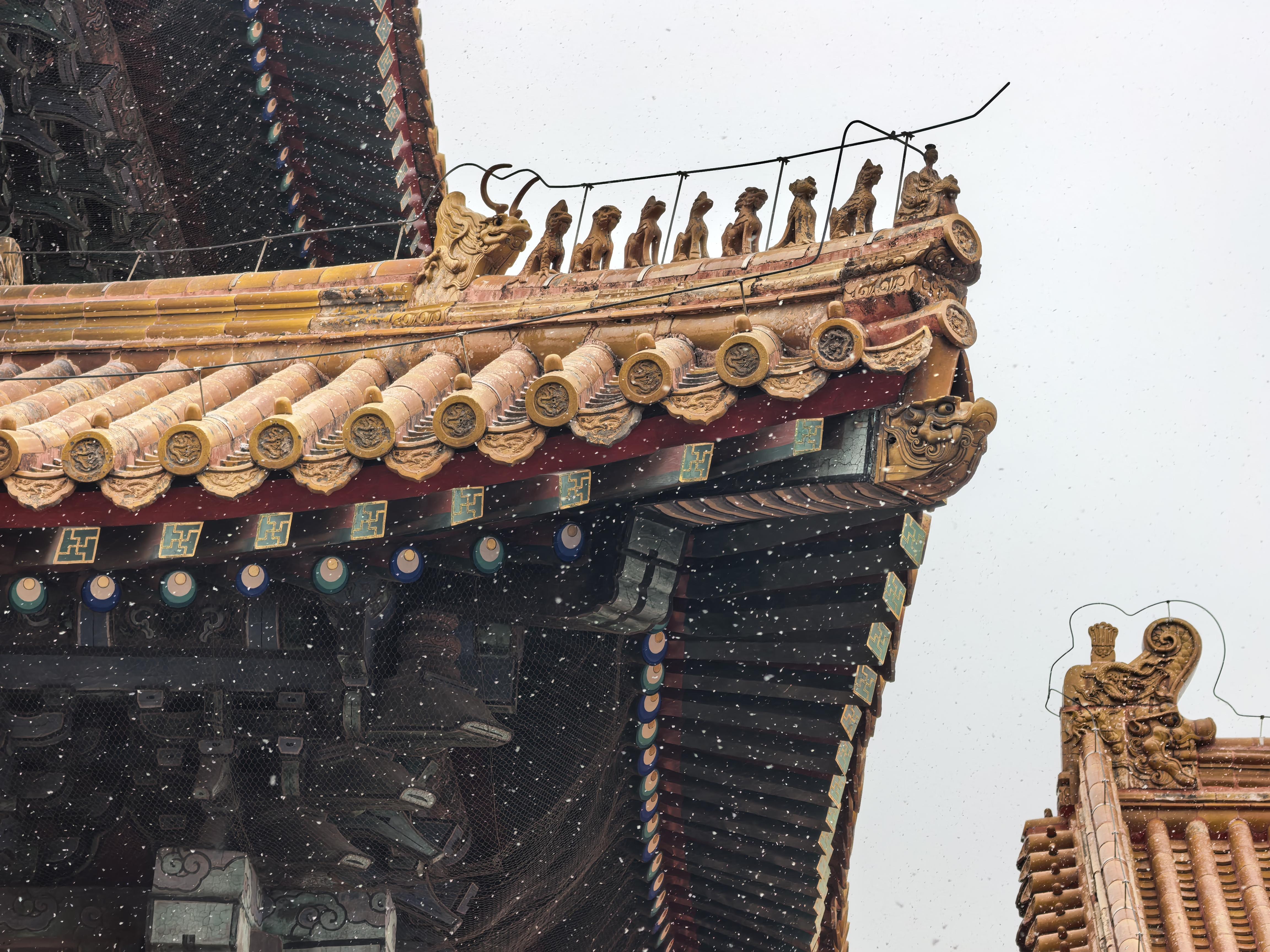 雪花落到紫禁城,自带背景音,淋漓尽致地展现中式浪漫。朱红色的宫墙、金色琉璃瓦……纷纷洒洒的白雪给饱和度高的紫禁城加了一层天然滤镜,为严肃的大殿添了一抹温度。