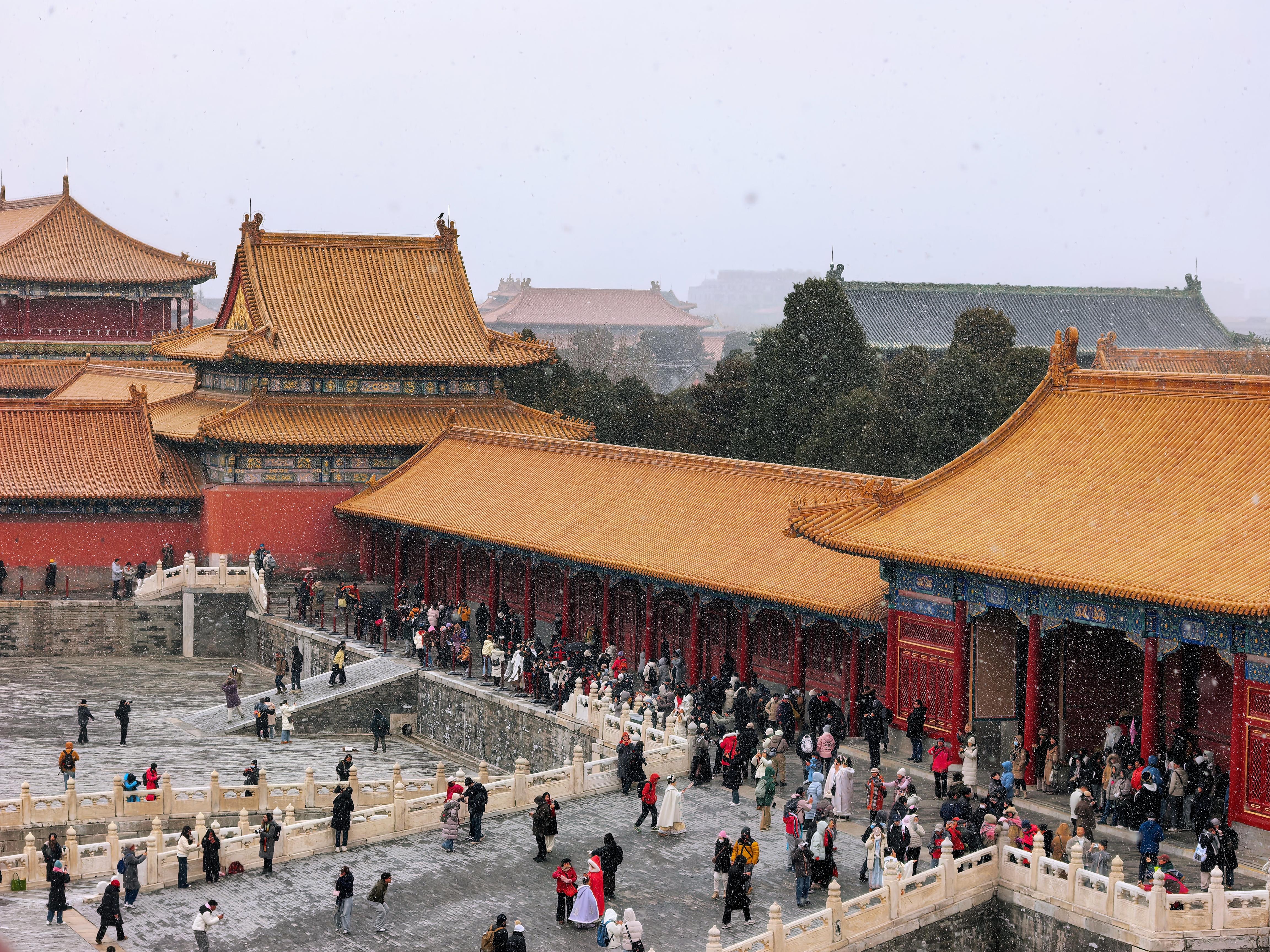 “真的下了”“下大了!快拍,能感觉到雪了”……纷纷洒洒的雪飘洒在故宫博物院,观众纷纷举起手机,找角度记录。