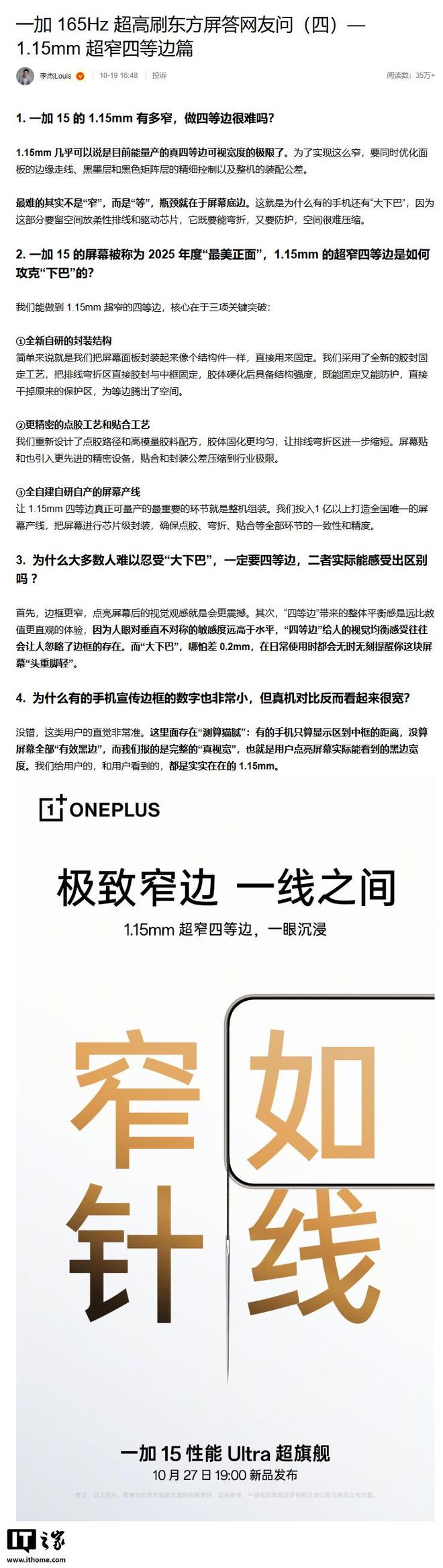 IT之家 10 月 19 日消息,一加中国区总裁 @李杰Louis 今日发布“一加 165Hz 超高刷东方屏答网友问(四)”,回答了关于 1.15mm 超窄四等边的部分问题。