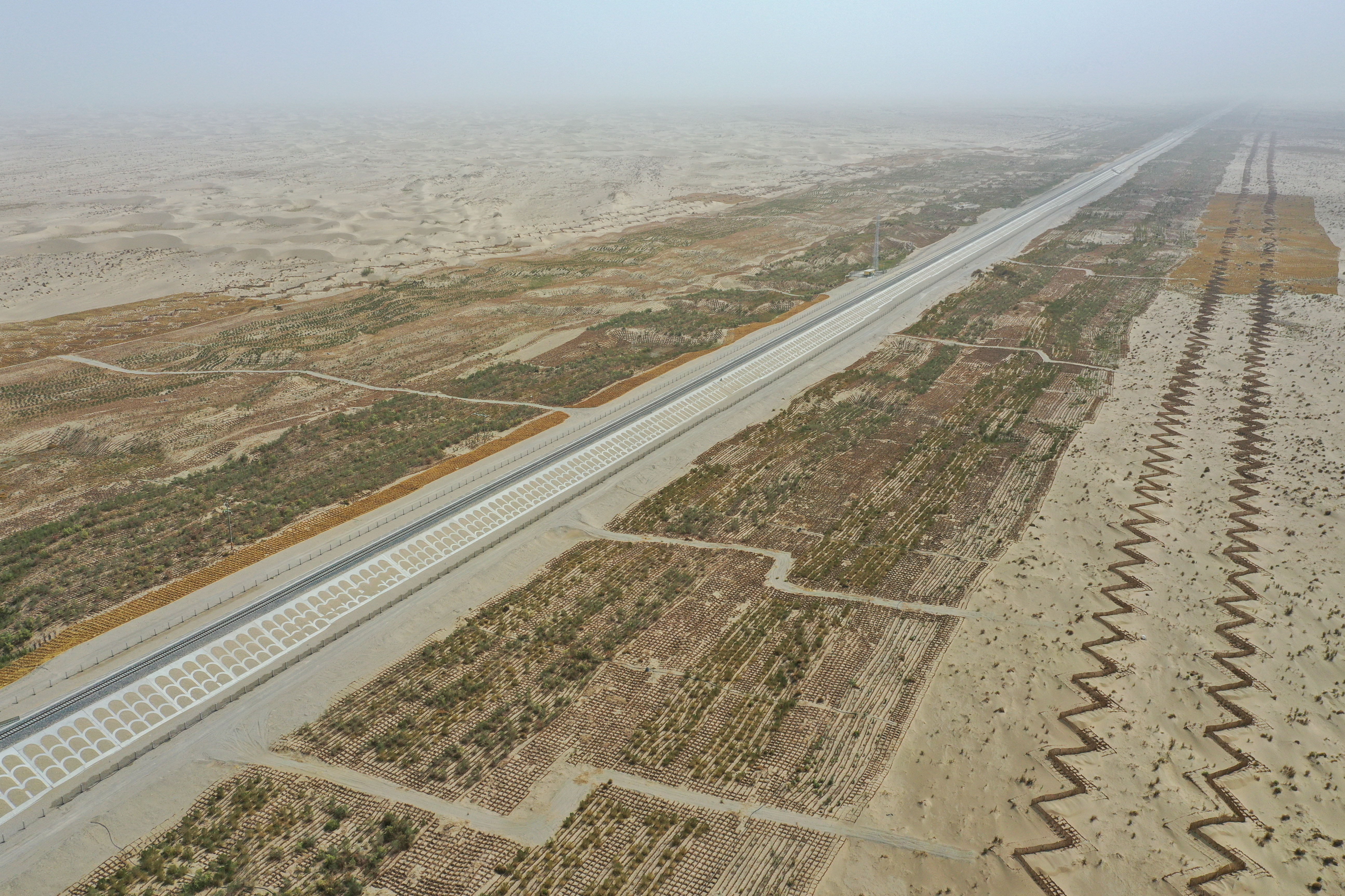 这是在和若铁路沿线拍摄的芦苇沙障、芦苇方格和耐旱植物组成的防沙“三件套”(2022年5月19日摄)。
