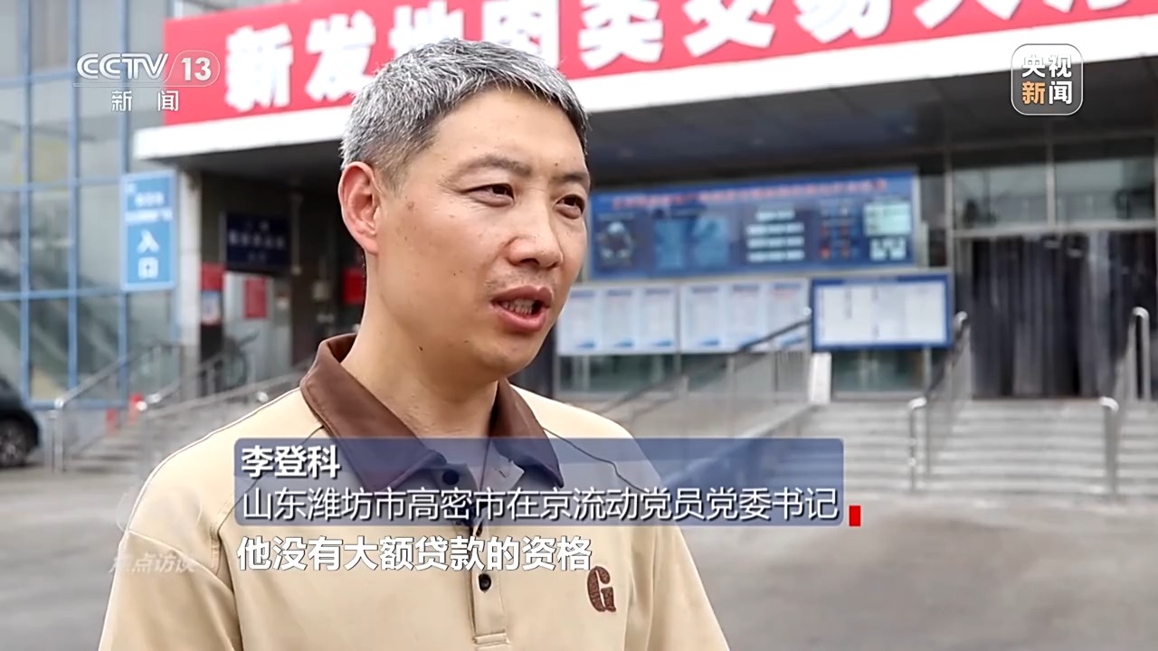 山东潍坊市高密市在京流动党员党委书记 李登科:资金困难比较突出,因为我们都是外地户籍,不属于京籍,他没有大额贷款的资格,所以我们跟老家的组织部、老家的党委进行沟通,协商了很多金融机构。
